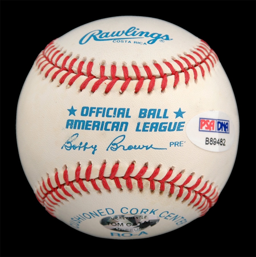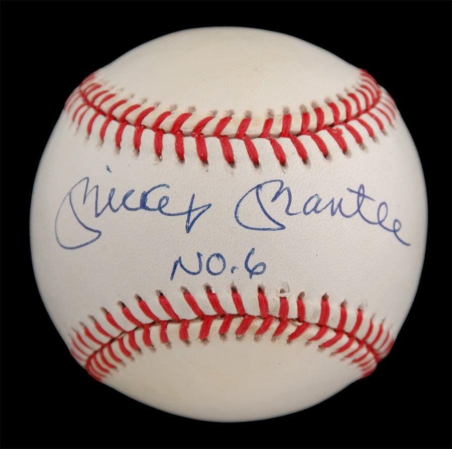 "The Mick" - who wore #7 on his back during his Hall of Fame career - signed No. 6 to this official American League (Brown) baseball, which has very, very slight toning but is still NRMT. The sweet spot signature in blue ink rates 9/10. PAS and Tom Catal stickers affixed. A triple-crown winner in 1956, Mantle was a 16-time All-Star, three-time MVP and seven-time World Champion during his 18-year career with the New York Yankees.