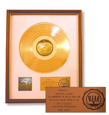 This rare white matte gold record award was certified on November 30,1973. It was presented to John Ono Lennon. This is an authentic R.I.A.A. Apple gold record award. EX. 17.5x21.5".
