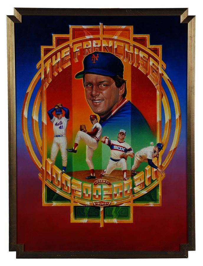 This unbelievable painting of pitching great Tom Seaver by artist Ron Lewis is sure to pop right off your wall with its lush colors and fantastic depiction of the 3-time Cy Young winner. The 24.5x33.5" oil-on-canvas features a main portrait of Seaver in his iconic Mets uniform, then below Tom Terrific are four depictions of Seaver in the various stages of pitching, wearing the uniforms of every team he played for (Mets, Reds, Red Sox). At the top of the painting is "The Franchise" in golden 3-D lettering, and below is "100 200 300 311" in the same lettering, indicating his career win milestones along with his final win total of 311. Protecting the image is a beautiful gold leaf frame. NRMT.