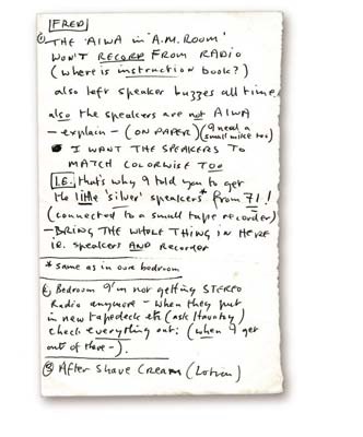 Three days before Double Fantasy was released John, on his daily "to do" list for his assistant Fred, asks that his stereo system be repaired. He wanted a particular pair of speakers to match his bedroom system. This note is dated on the reverse by the assistant November 14,1980. All lov-ingly written in John's hand. With LOA from top expert.