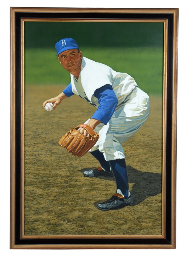 Dodger great Pee Wee Reese is displayed here in all his double-play turning, line-drive snagging glory by artist Arthur Miller. The oil-on-board has been framed to 24.5x35.5" and features a crouching Reese preparing to throw a baseball. Miller has painstakingly created an almost photorealistic depiction of the famed shortstop. Reese played his entire career with the Brooklyn/Los Angeles Dodgers, and was selected to 10 straight All-Star Teams during that time. Reese also won the 1955 and 1959 World Series, and was eventually elected to the Baseball Hall of Fame in 1984. Painting is NRMT, and has Miller's signature on both the front and back. Dated 1998.