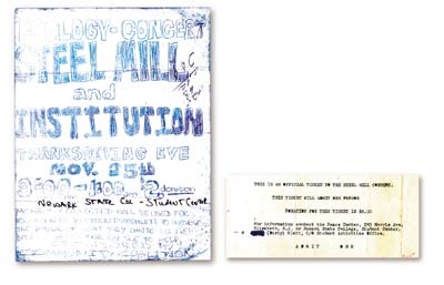 Fascinating piece of Brucabilia is as about as early as they come. Left wing "Ecology-Concert" at Newark State College Student Center on Thanksgiving Eve is for Steel Mill and Institution. Folded and some ink numbers o/w EX. Includes the earliest Bruce ticket we have ever seen. Fir the same concert the top reads, "This Is Ian Official Ticket To The Steel Mill Concert." Has several folds and some writing (8.5x3.5").