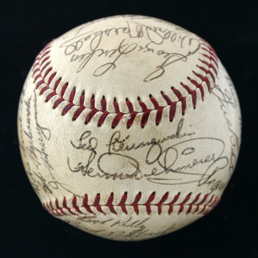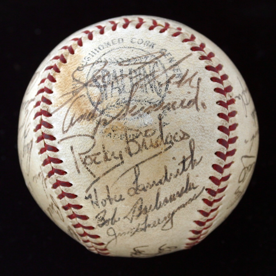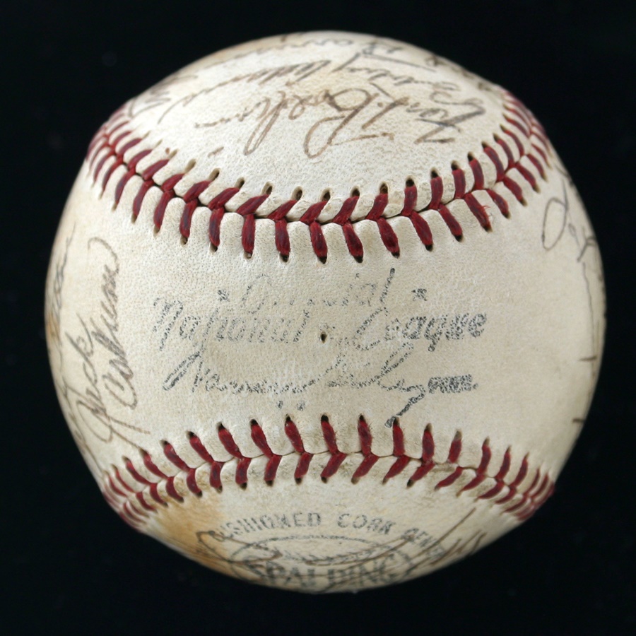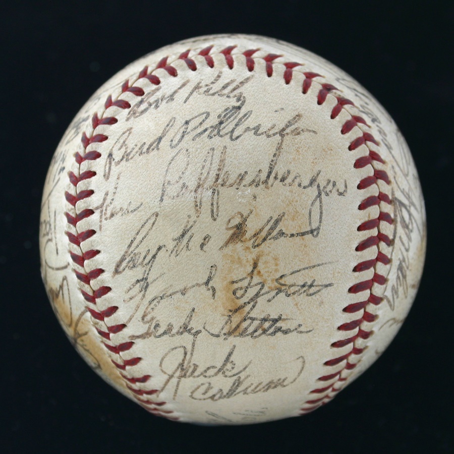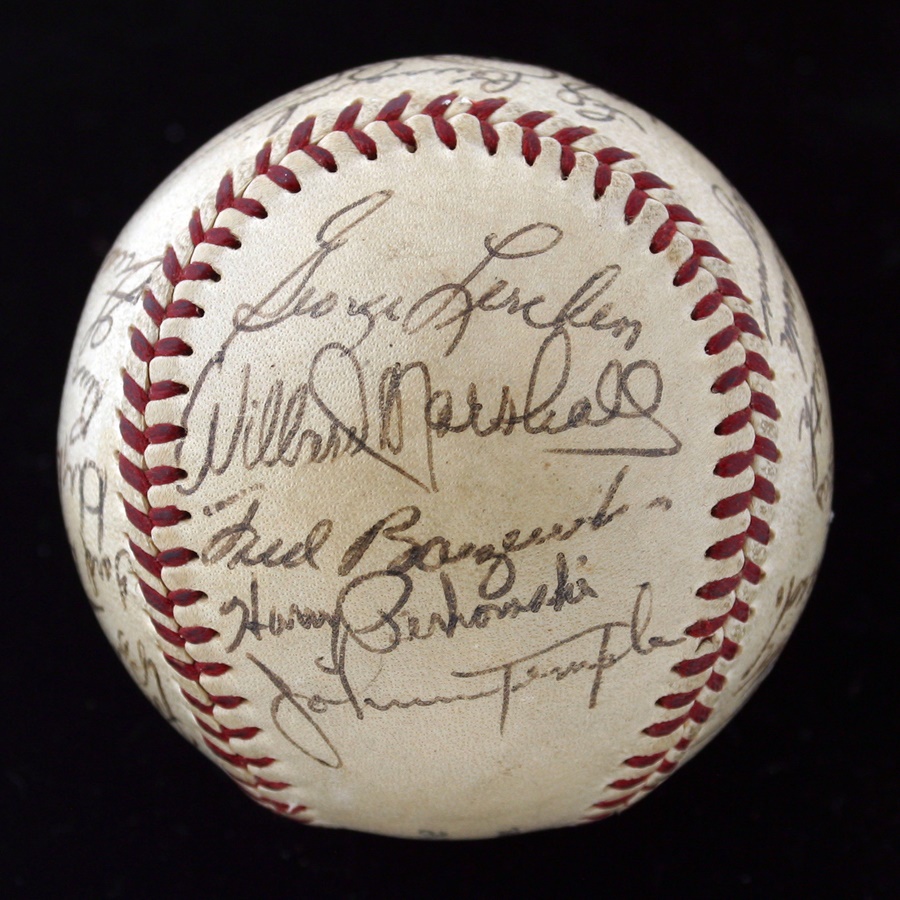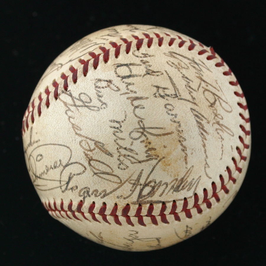 Official National League (Giles) baseball is in EX condition and contains 27 signatures of the 1953 squad. Included is manager Rogers Hornsby, Klu, Bridges, Bell, Temple and the rest of the boys. Signatures in pen average 7/10. This is a rare team ball, and comes from the season where fervent anti-communist sentiment from the public forced the Reds to change their name to the "Redlegs".