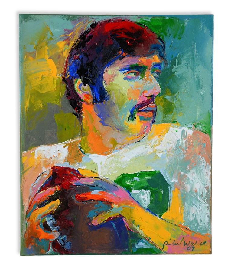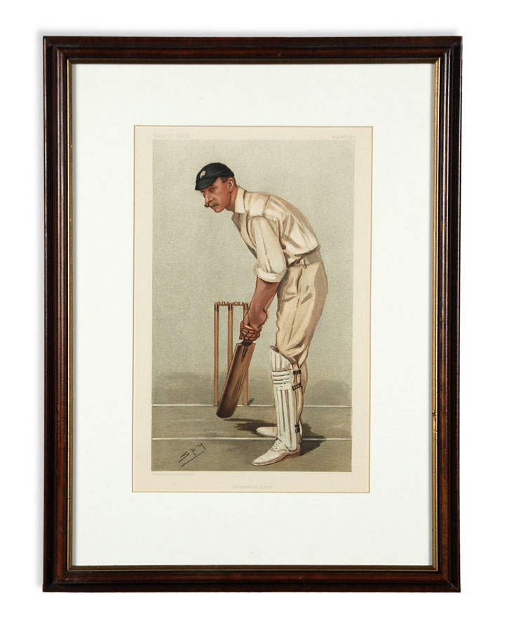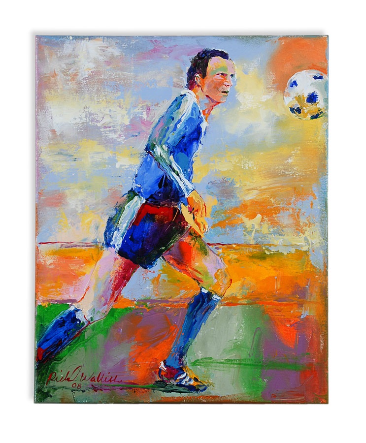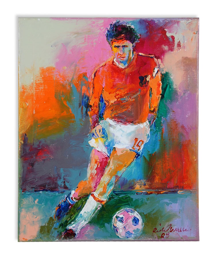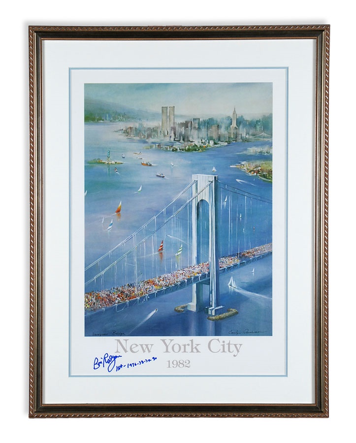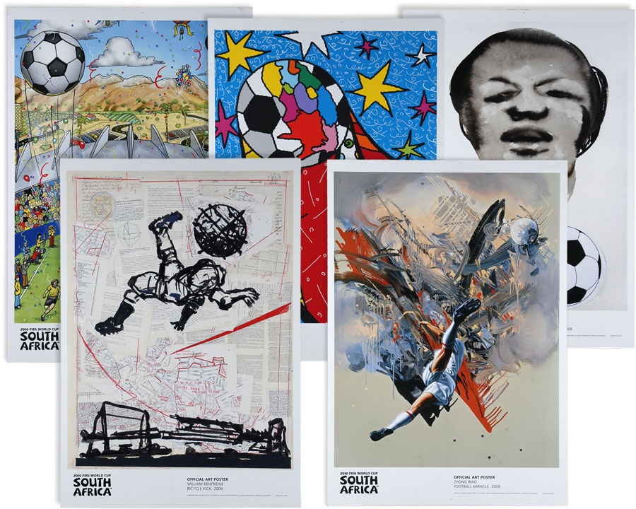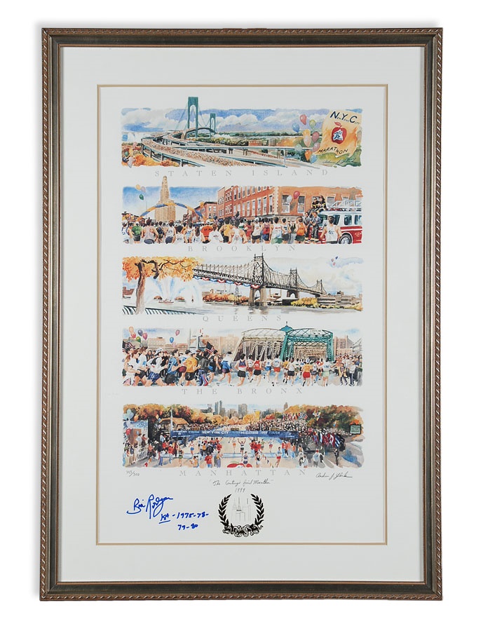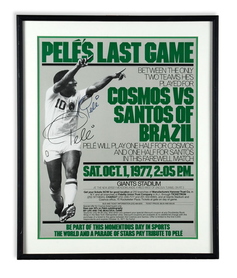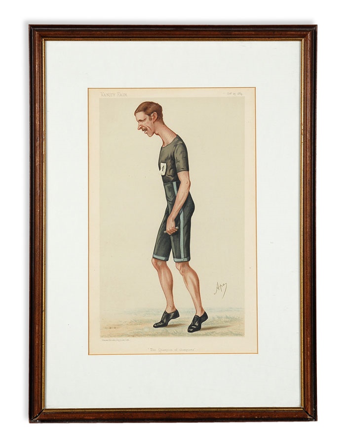 A truly eclectic mix of sports art and memorabilia. Includes: Tampa Bay Lightning Inaugural Season programs, complete sets of commemorative 1994 and 1998 World Cup pins, three framed Vanity Fair "Men of the Day" illustrations including Frank Stanley Jackson, Michael Rimington, and Walter Goodall George, a Perez-Steele card of the Waner Bros., two New York Cosmos autographed photos from Werner Roth and Santiago Formoso, numerous bodybuilding programs, an Ali/Frazier III program, a framed photo of a young Kareem Abdul-Jabbar playing for UCLA, seven Richard Wallich impressionist sports paintings, 17 original World Cup 2010 posters, and over a dozen pieces of framed sports art, including a Pele signed print. Average condition is EX.