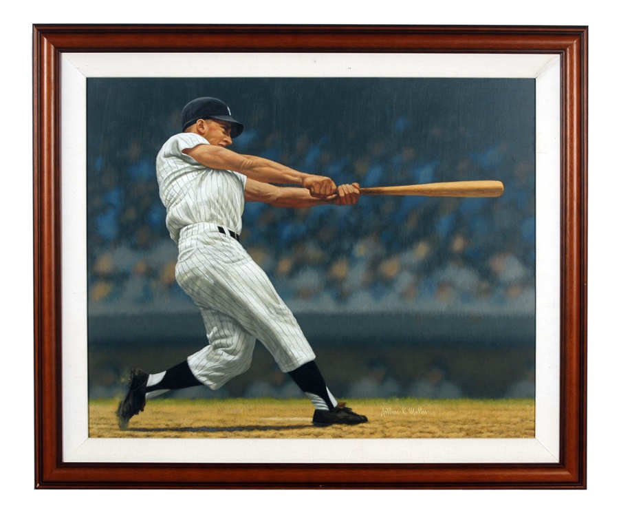 A sublime painting of Yankee slugger Roger Maris by famed sports artist Arthur Miller. In the 25.5x31.5" oil on board painting, Maris is depicted at full extension during a swing of the bat, likely sending yet another baseball over the right field wall. Note the puff of dust that Miller has included on the left foot of Maris, and the tightly coiled muscles in Maris' powerful arms. Meant to be hung with pride alongside other great pieces of sports memorabilia. NRMT.