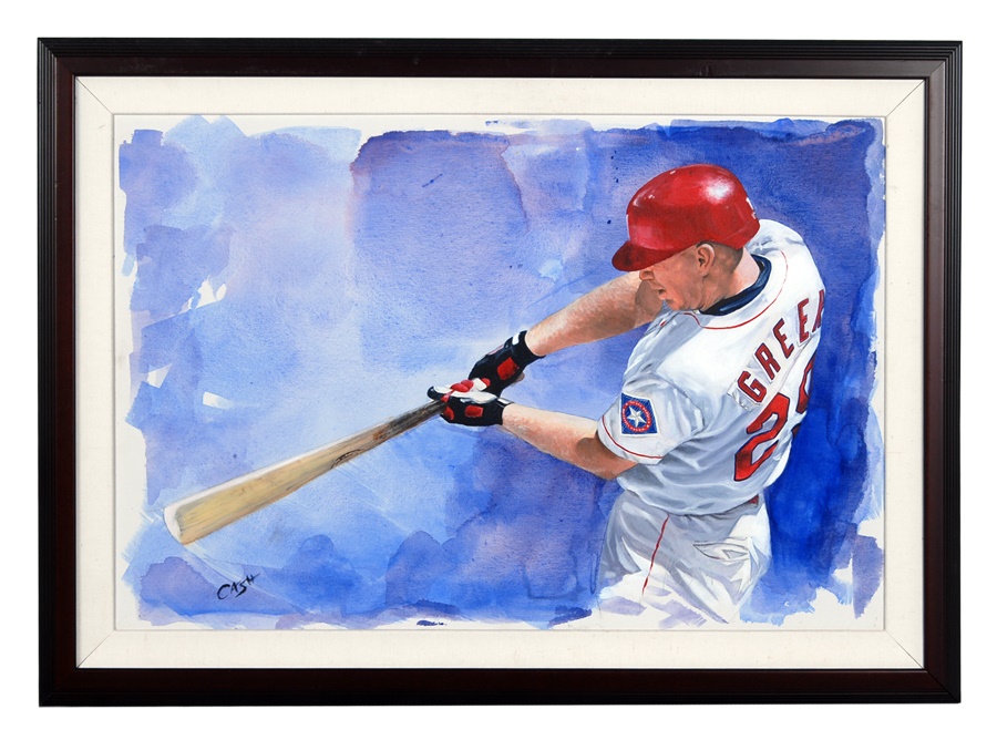 A real stunner of an oil painting by artist Eric Cash. This eye-catching 24x37.5" oil & watercolor on canvas piece shows Texas Rangers stalwart Rusty Greer uncorking a perfect swing. The color of the oil used for Greer is brilliant, and he is surrounded by multiple hues of blue watercolor. Greer played his entire career with the Texas Rangers and put up excellent stats, including a .305 career batting average and 614 RBIs, but his aggressive playing style landed him on the DL many times and ultimately cut his time in the MLB short, severely hampering his overall statistics.