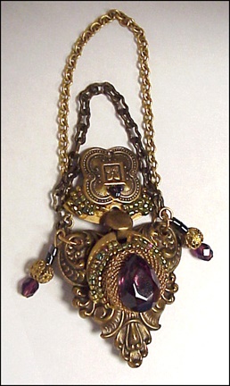 An elaborate brass costume jewelry brooch with faux stones. Another beautiful piece of Janis history given to her friend Miriam.