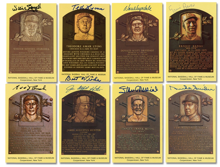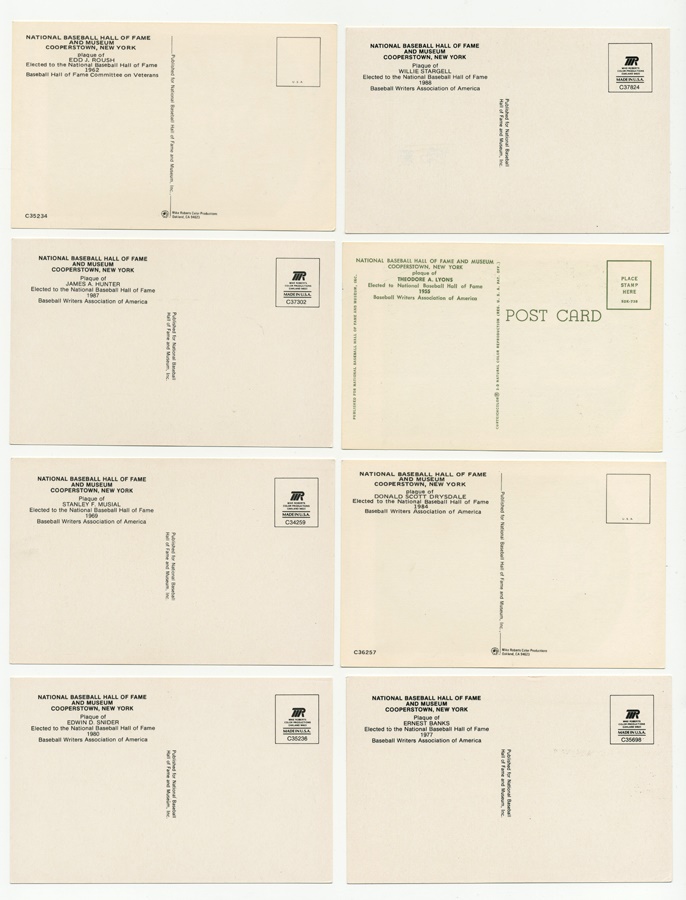 All 38 of these fine cards from Cooperstown are front-signed with signatures averaging 8/10. Three have cut signatures pasted on them. All are different and include Berra, Hunter, Drysdale, Banks, Killebrew, Coveleski, Boudreau, Grimes, Kiner, Kaline, Lyons, Musial, Snider, Roush, Stargell, Mathews, Hubbell, Feller, Spahn, Roberts and Brooks Robinson. The postcards average EX-MT.