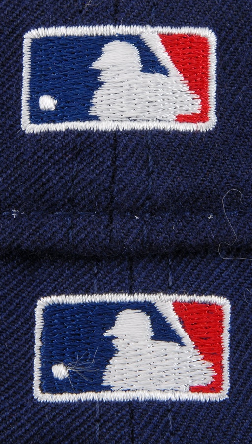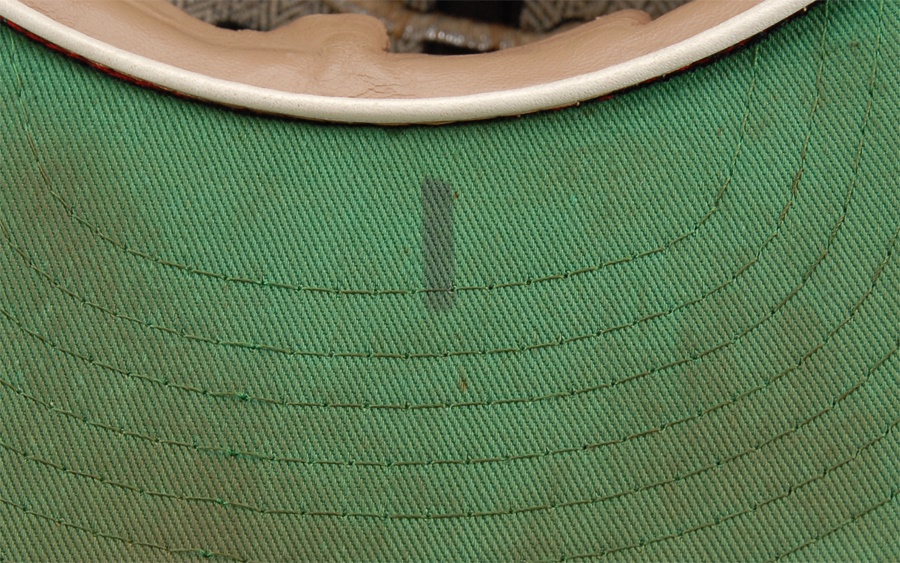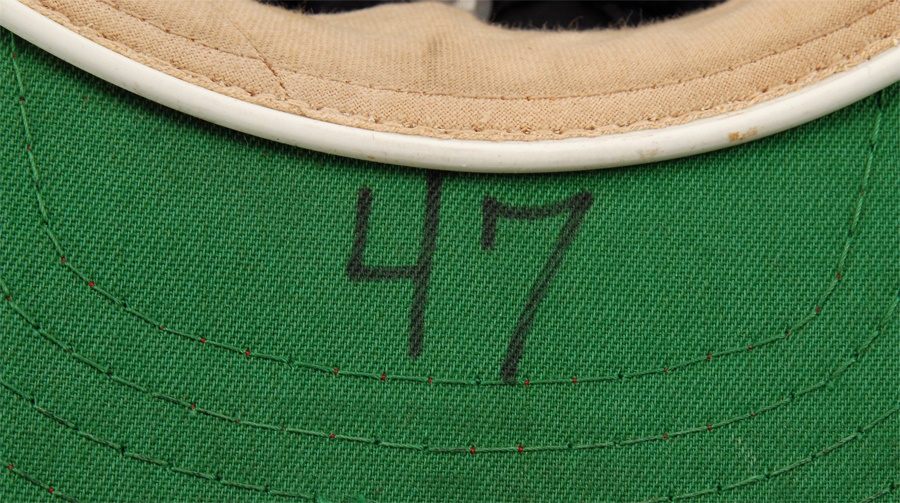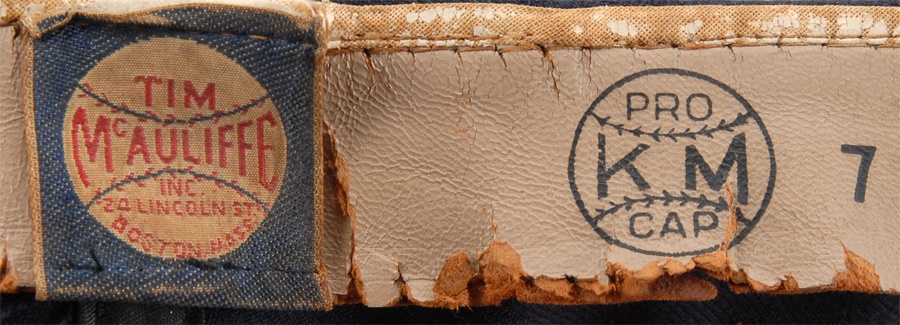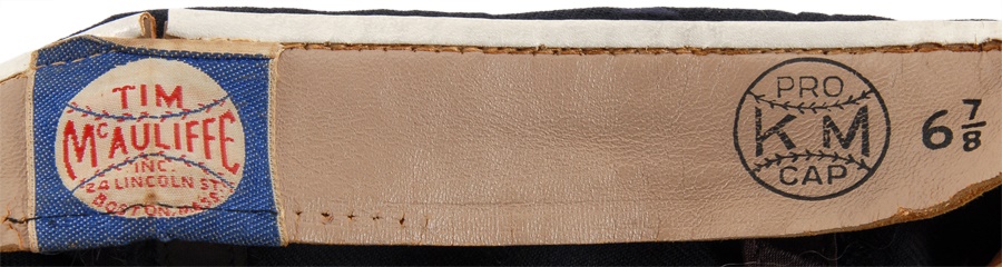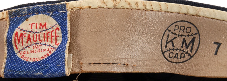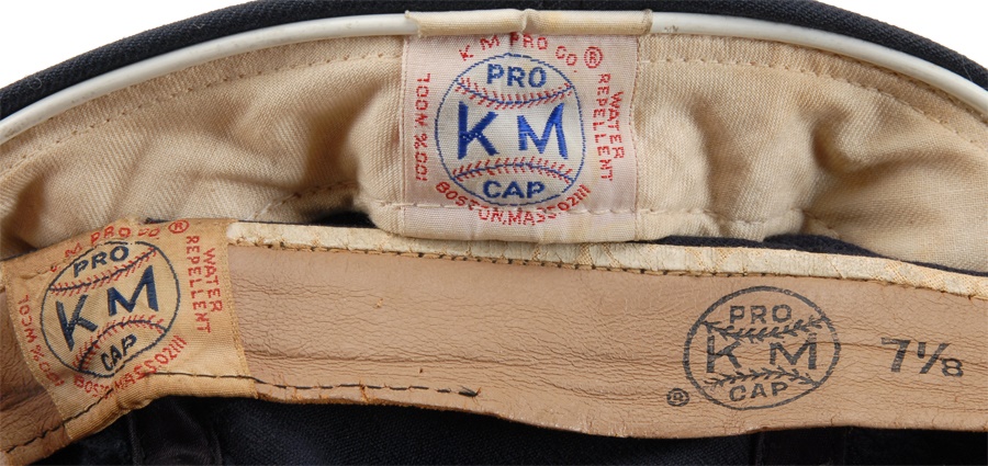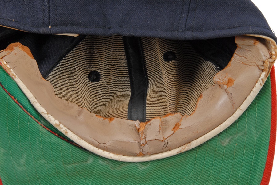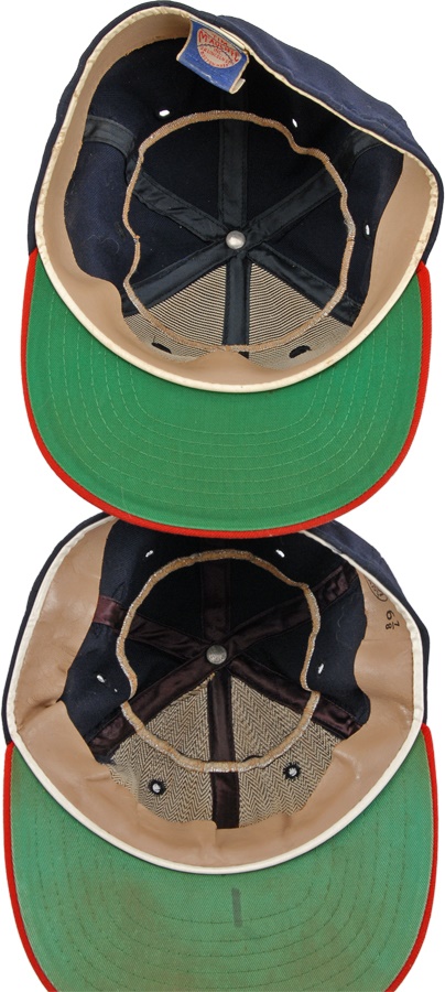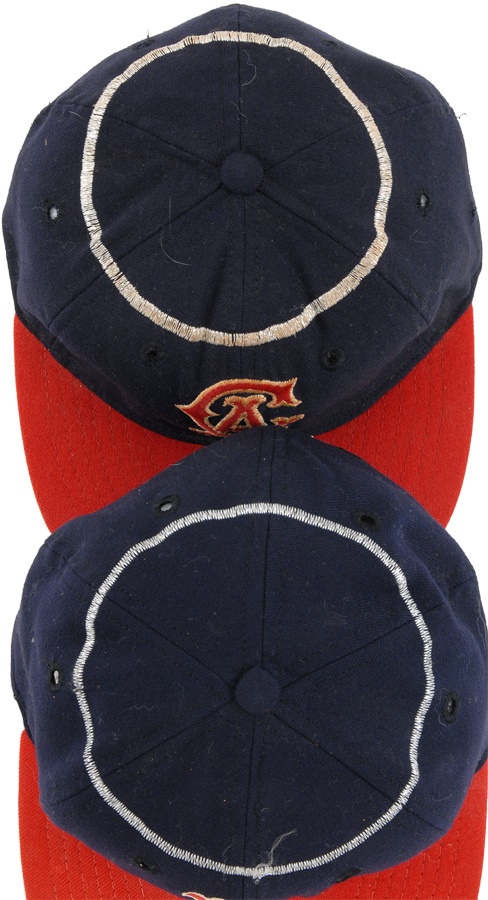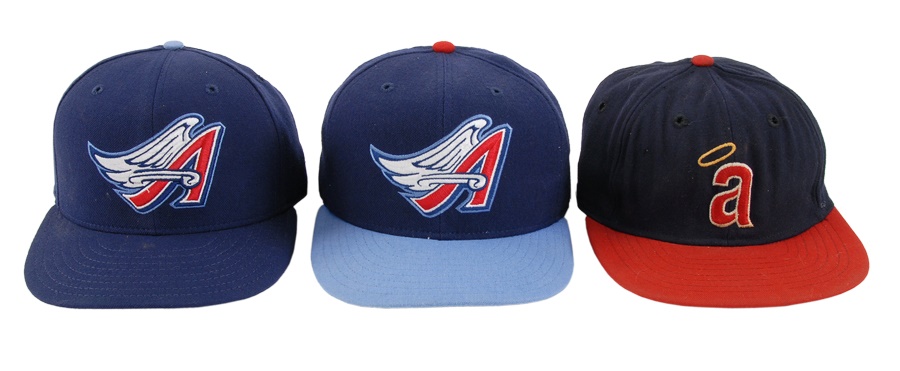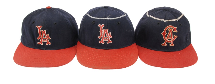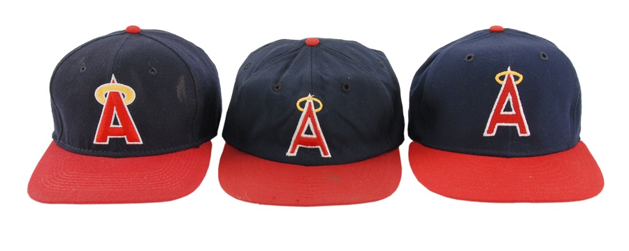 These nine caps from the Angels include several variations: LA Angels caps include a circa 1961 by McAuliffe (leather headband is cracking) and a circa 1962 by McAuliffe with silver halo on top. California Angels caps include a circa 1966 McAuliffe worn by Jose Cardenal (#1 under the brim), a circa 1971 KM Pro worn by Ken McMullen (#7 under the brim), a circa 1975 KM Pro worn by Steve Blateric (#47 under the brim), a mid 1980s by New Era, and a late 1980s by Pro Sports Specialties. Aneheim Angels caps include two 1990s variations by New Era. The caps that are worn show varying degrees of usage.
