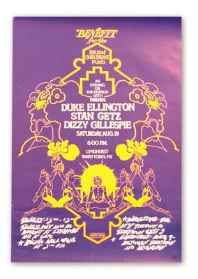 A very rare concert advertisement for a benefit concert August 19, 1972 starring Duke Ellington, Stan Getz, and Dizzy Gillespie. A magnificent example of Max's fine line art. EX.
