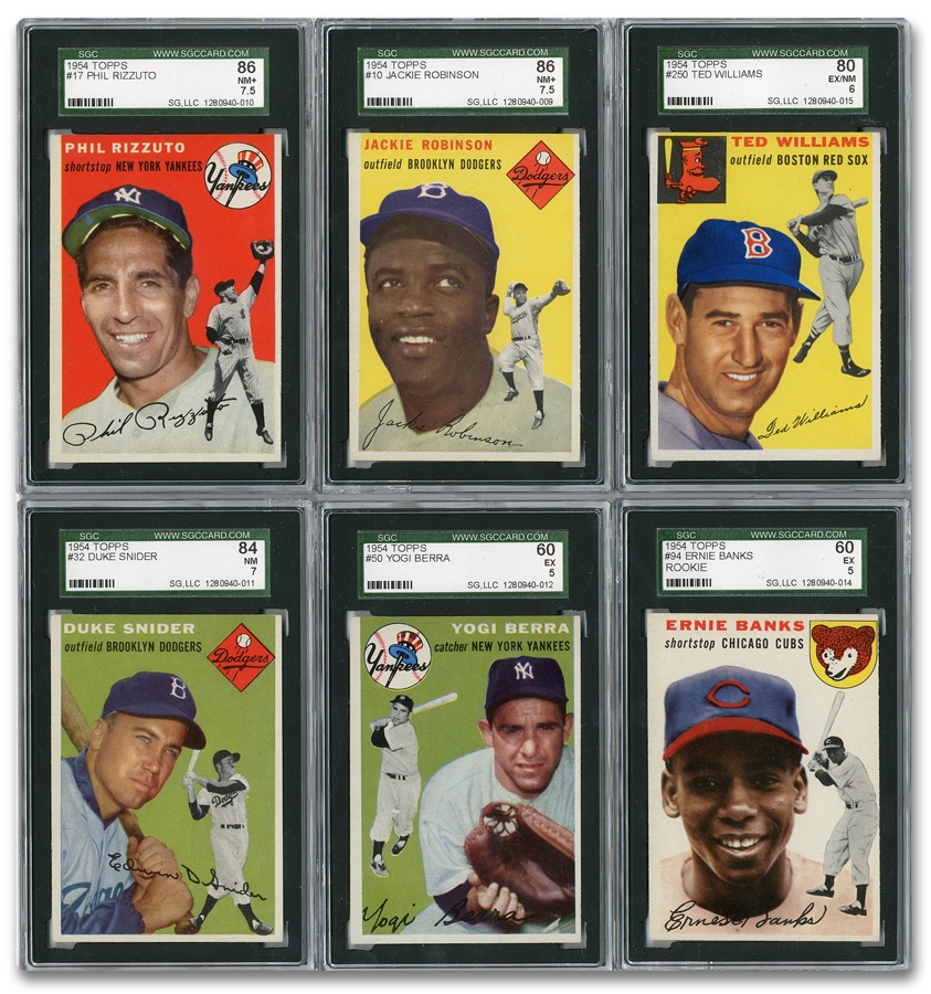 All six of the 1954 Topps cards included in this lot are stellar examples for their grades. The cards included, and their grades, are as follows; #10 Robinson (NM+ 7.5), #17 Rizzuto (NM+ 7.5), #32 Snider (NM 7), #50 Berra (EX 5), #94 Banks (EX 5), and #250 Williams (EX/NM 6).