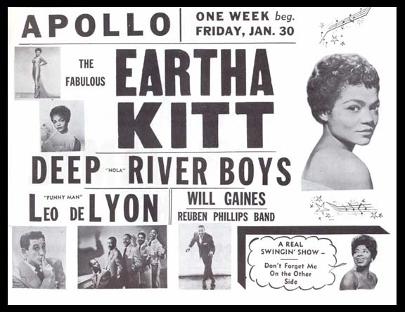 This two-sided handbill advertis-ing Eartha Kitt, The Deep River Boys, Dakota Station, Art Blakey, Ahmad Jamal, and comic Nipsey Russell, and others appearing January 30 - February 13 at the Apollo Theatre in Harlem, New York. NRMT