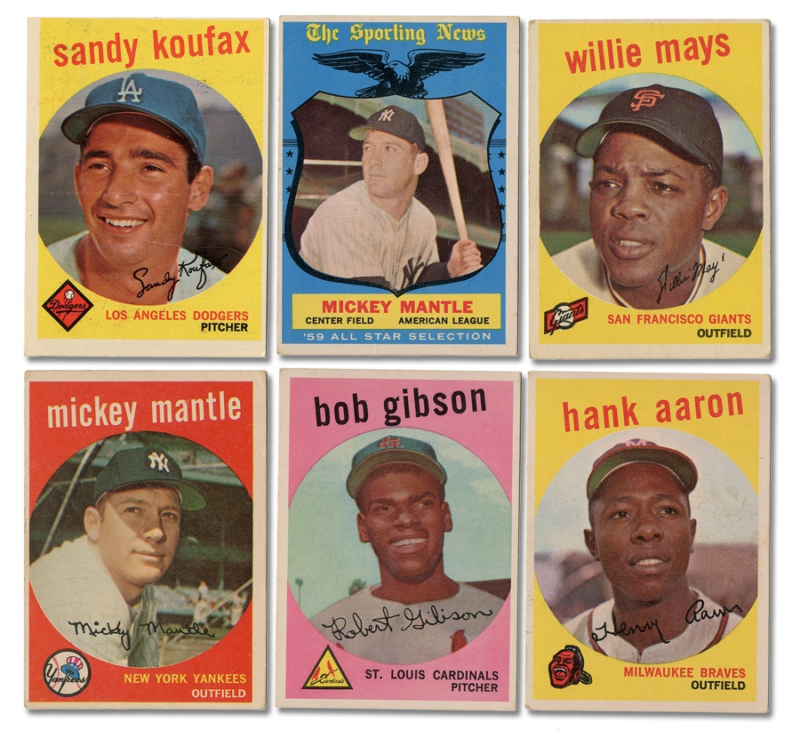This 1959 Topps set has an overall grade of VG to VG-EX. The key cards and their grades are as follows: #10 M. Mantle (VG-EX), #50 W. Mays (VG-EX), #150 S. Musial (Good), #163 S. Koufax (EX but off-cut to the top), #202 R. Maris (Good off cut to the left), #380 H. Aaron (VG-EX), #514 B. Gibson (EX+), and #564 M. Mantle AS (VG-EX). A very consistent set all the way through.