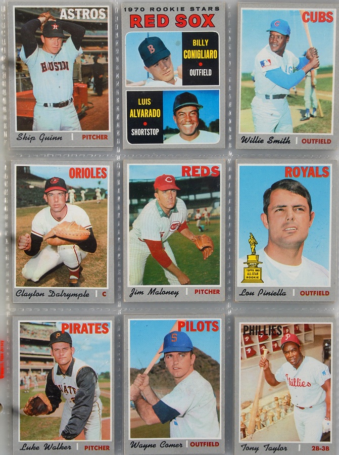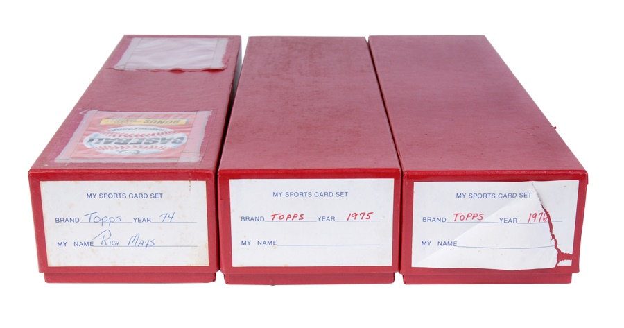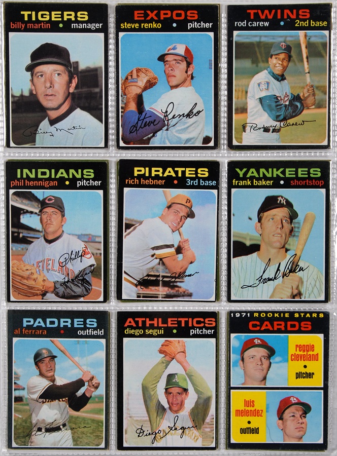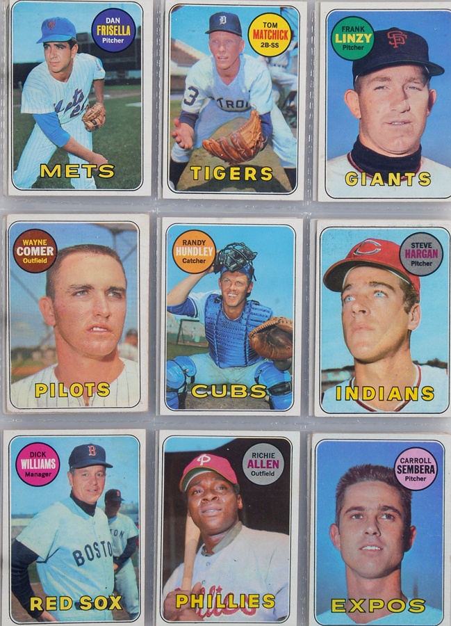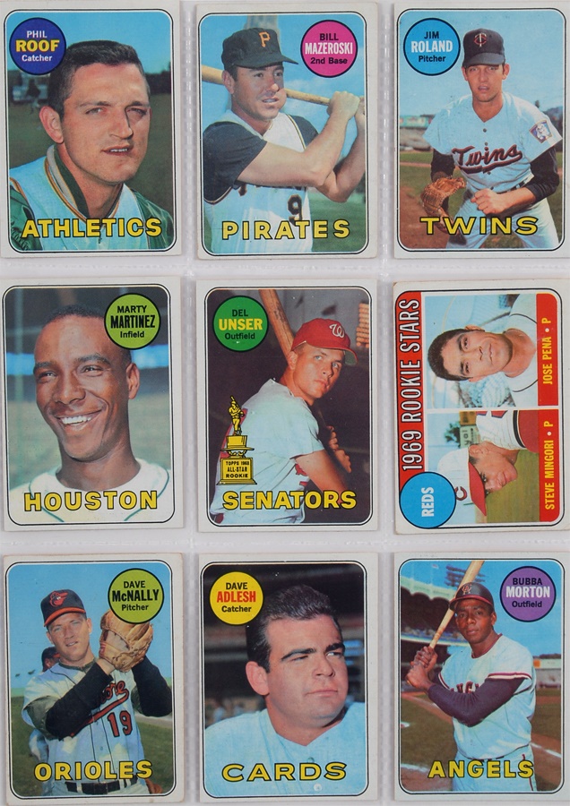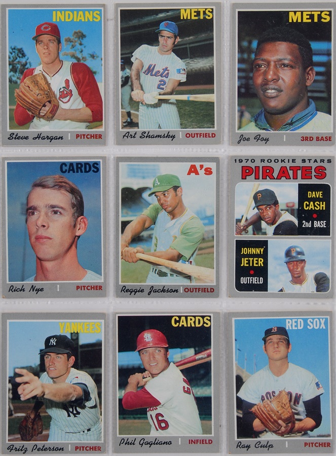This collection of Topps Baseball sets is a near run from 1969 to 1976 (missing only 1973 & 1974). The 1969 set averages VG to VG-EX with key cards as follows: #50 Clemente (Good), #95 Bench (Good), #100 Aaron (VG-EX), #120 Rose (Good), #190 Mays (VG), #260 Jackson (VG), #500 Mantle (VG-EX o/c), and #533 Ryan (VG-EX). The 1970 set averages VG-EX with key cards as follows: #140 Jackson (VG-EX), #189 Munson (EX-MT), #350 Clemente (VG), #500 Aaron (VG), #580 Rose (EX), #600 Mays (EX), and #712 Ryan (EX). The 1971 set averages VG-EX with key cards as follows: #5 Munson (VG), #100 Rose (VG), #513 Ryan (EX), #600 Mays (VG-EX), and #630 Clemente (VG). The run picks up again with 1974,1975, and 1976 sets that average EX-MT in condition.