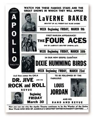 Here's one featuring the incredible LaVerne Baker, plus The Four Aces, The Dixie Hummingbirds, Louis Jordan, Dr. Jive Rock and Roll Revue, and others March 2 - March 30 at the Apollo. EX-NRMT, folded as often distributed.