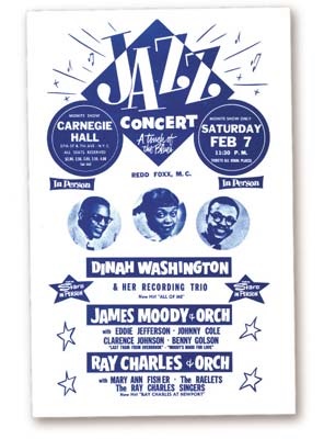 Stunning boxing style 5.5x8.5 handbill with the amazing Dinah Washington, James Moody, and Ray Charles plus comic Redd Foxx as M.C. appearing on February 7th at Carnegie Hall in New York City. NRMT.