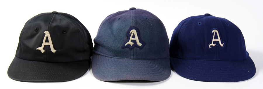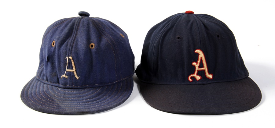 Before moving west to Kansas City, and then further west to Oakland, the Athletics built a dynasty in Philadelphia, where they called home for the first half of the 20th Century. This collection of Philly A's hats consists of a well-worn 1940 Spalding with "Hancken" sewn inside the headband. This was worn by catcher and eventual manager Buddy Hancken. There's also a late 1940s Spalding with a hard liner inside that was worn by slick-fielding third baseman Hank Majeski. There's also an early 1950s McAuliffe with E.J. written under the bill and attributed to Eddie Joost; early 1950s by Leslie that is not game worn; and a circa 1954 model by Mitchell and Ness exhibiting a lot of wear and the number "14" under the bill.
