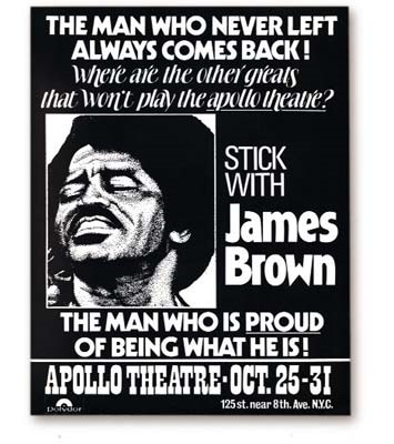 When the Apollo Theatre was struggling to survive in the early 70's they could always count on the Godfather of Soul, James Brown "the Man Who Never Left Always Comes Back!" to the Apollo Theatre in New York City, October 25 - 31. "The Man Who Is Proud of Being What He Is!" NRMT.