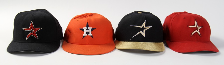 This lot of nine Houston baseball caps provides a trip down memory lane. The most eye-catching piece is a circa-1964 Colt .45's hat by McAuliffe. With a cracked brim heavy use evident, this size 7 1/4 cap has the number "10" of its wearer, Rusty Staub, written in faded black marker on the bottom of the brim next to a faded Staub autograph (in blue marker). The rest of the lot includes a variety of size 7 3/8 Astros caps from the 80s and 90s - some used and others not. Finally, a mid-70s bright orange New Era cap, size 7, can be found in pristine condition. Overall, these caps are of EX quality and a must-see for any lifelong Astros fan.