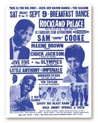 An all night to dawn "Breakfast Dance" at the Rockland Palace in Harlem, New York featuring Sam Cooke, Maxine Brown, Chuck Jackson, Jive Five, The Olympics, Little Anthony of the Imperials, and others appearing on September 9. EX-NRMT. 8.5x11".