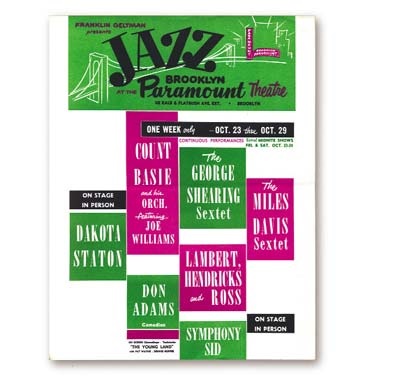 Cool handbill advertising a Jazz At the Brooklyn Paramount" with Count Basie and His Orchestra with Joe Williams, The Miles Davis Sextet, Lambert, Hendricks, and Ross, Dakota Staton, and comedian, Don Adams (long before Get Smart") appearing October 23 - 29. EX.
