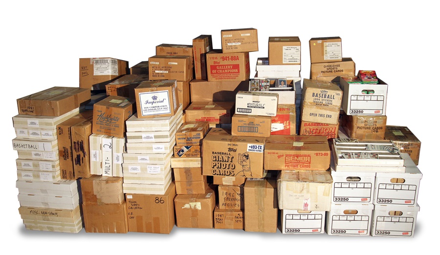This is just an amazing lot that includes a little, or maybe we should say a lot, of just about everything. The years included start in the mid 1970s and wraps up in the early 1990s. The material included is way too vast to give a detailed account of everything but some of the highlights are as follows. 1976 Isaly's Disc Sets (over 180 sets plus many extras), O-Pee-Chee cut/vending cases (1983, 1984, 1987, and 1988), Fleer bulk/vending cases (1983 and 1984), Donruss (1986 Factory set case, 1986 Highlights case, plus many other smaller Donruss sets), 1984 Topps Hockey Vending case (opened & sorted; approximately 60 Yzerman rookies), 1983 Topps Olympics (six box rack case), and way too many individual sets and singles from the 1980s to list. Non-Sport fans will not be left out of this lot either many sets of Sgt. Pepper and The A Team to name a few along with assorted sets and wax from Garbage Pail Kids. The list could go on and on but the fact remains, if you like breaking down or saving quantities of sets then it is well worth a trip to Bohemia, NY to view this lot for yourself. Incalculable break potential!