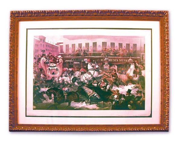 Impressive and important lithograph entitled Sleighing In New York by Thomas Benecke depicts winter street life in New York City, centered around the world famous "Barnum's Museum." Captures the essence of NYC in the mid 1850's. Children are playing, and stagecoaches carry the elegantly dressed New York society. There is a white carriage memorial to Zachary Taylor, the beloved President who recently died in office. Barnum's Museum is the dominating force with huge sign out front. The distinctive animals painted on the windows are a familiar association, for the populace, of this wonderful place. Printed by Nagel & Lewis in 1855. This print is from the Library of Congress Collection, and was deacquisitioned in the 1960's. The back states all this information and is inscribed by the Library of Congress. Print itself is 25x34"; framed overall, 35.5x42". Except for a little edge wear, condition is NRMT. Barnum's Museum was one of the biggest attractions in the world. The brainchild of impresario P.T. Barnum (one of the most famous men in the world), it would be burnt down and rebuilt more than once. With the Brooklyn Bridge, it is as impor-tant a symbol of 19th century NYC as any other.