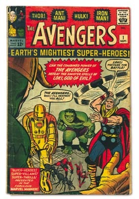 Another rare Marvel book, this Avengers number one fea-tures Thor, Antman, Hulk and Ironman. It is drawn by Jack Kirby and written by legend Stan Lee. This rare 1963 comic is a must have. This copy has some wear and creasing on the front cover and slight staining on back cover. Inside looks clean with a little age. G to VG.