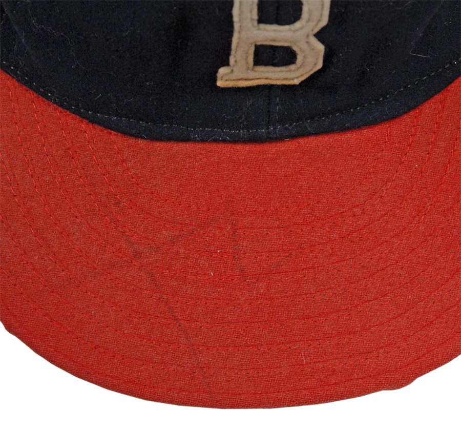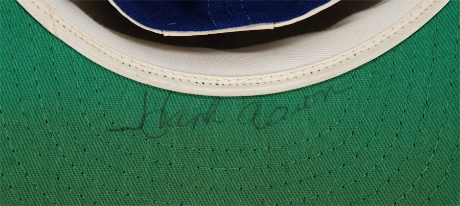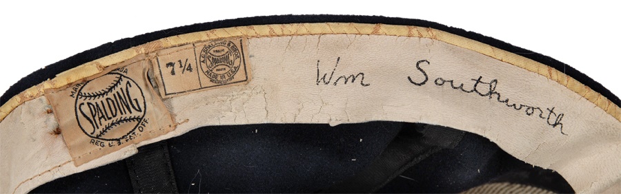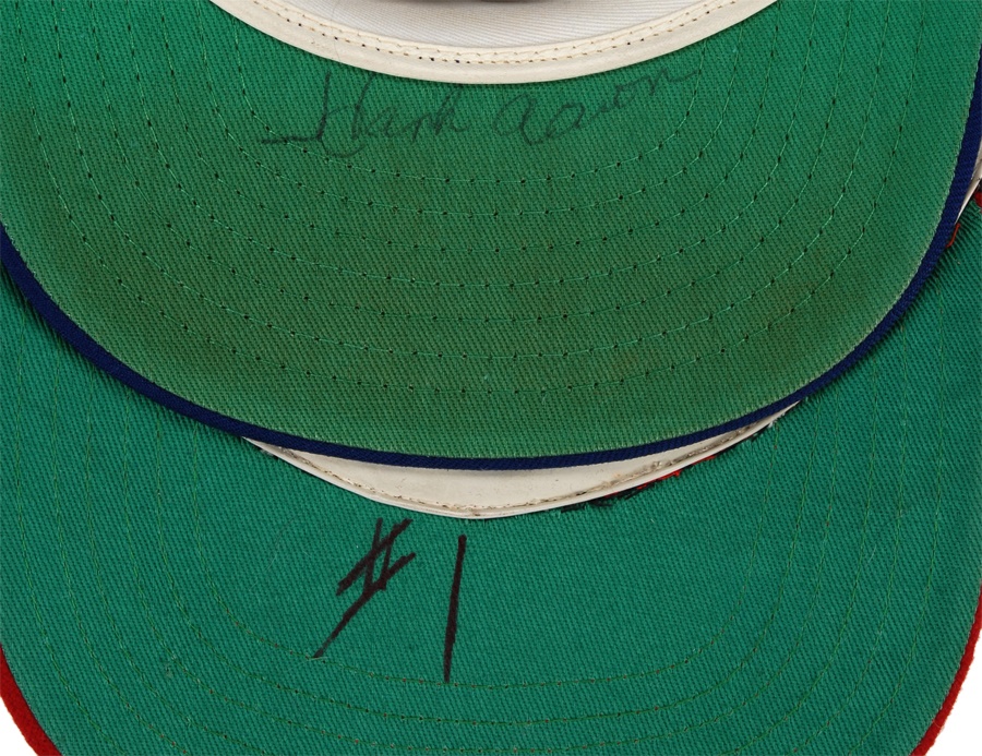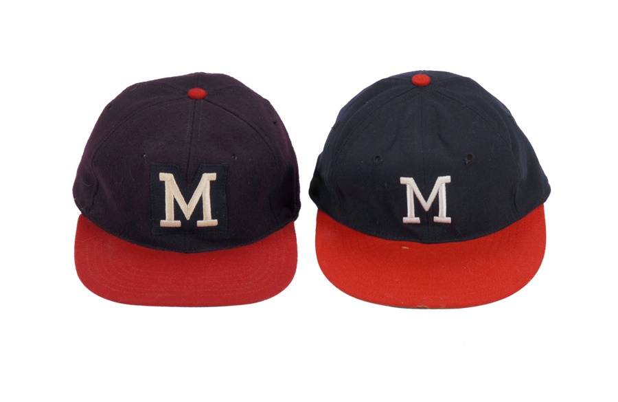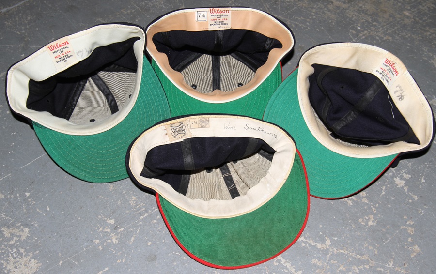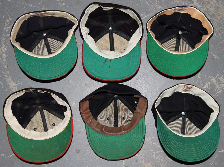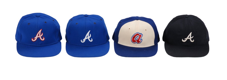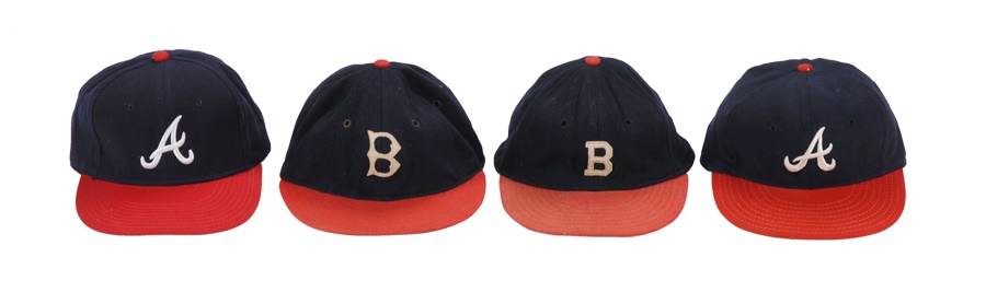The Braves baseball franchise has had a somewhat vagabond history, having called Boston, Milwaukee and Atlanta home over the years. This fine collection of caps nicely encompasses all the incarnations from the 1930s right up to 2000. The oldest hats - from the Boston years - include a 1930s Spalding model with "Wm. Southworth" written on the bank inside and worn by outfielder Billy Southworth; as well as a 1940s cap with replaced leather band inside. From the Milwaukee era, there's a 1950s cap by Wilson showing no use and a leather band inside. There's also a late 1950s model with a white vinyl band inside and "1" written under the brim. And from the most recent Atlanta period, check out the black, late 1960s cap by Wilson which shows no use. In addition, there's a mid-1960s by Wilson with a red brim, an early-to-mid-1970s cap by KM Pro showing no use but is signed under the brim by Hank Aaron. There are also mid-1980s home and road models by New Era and a late 1980s model by New Era