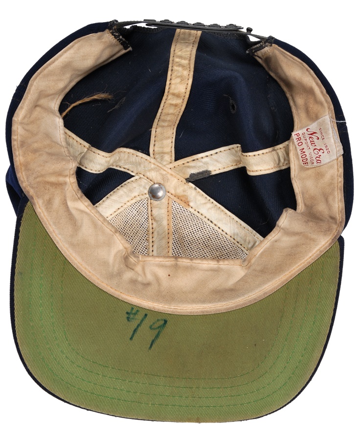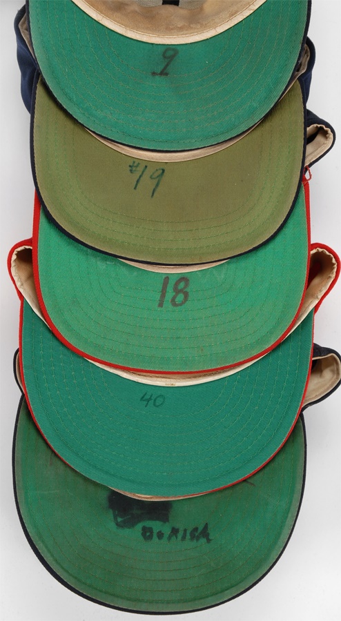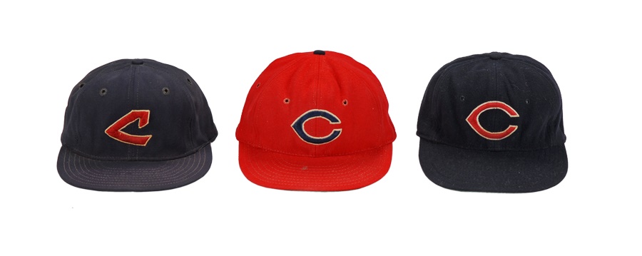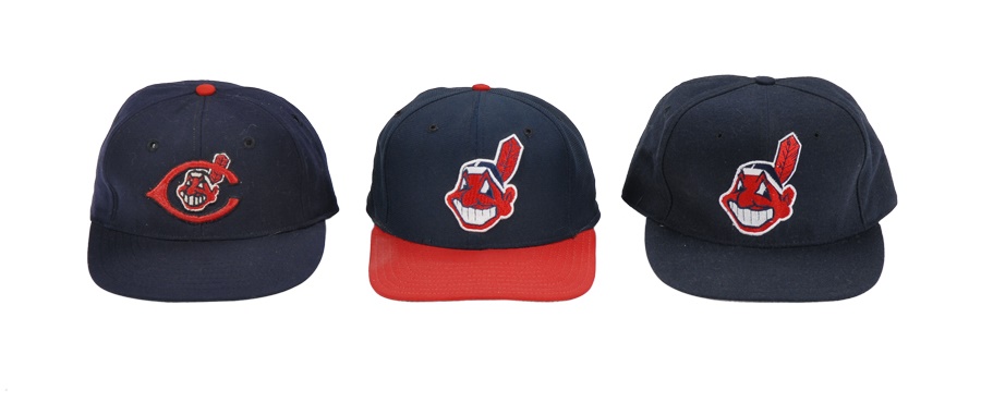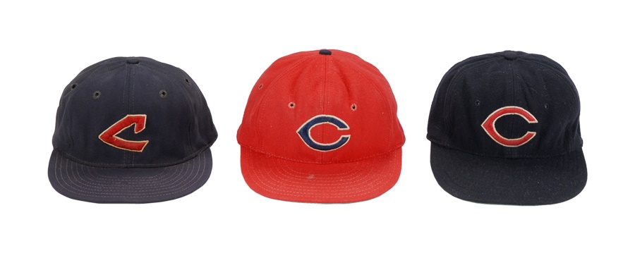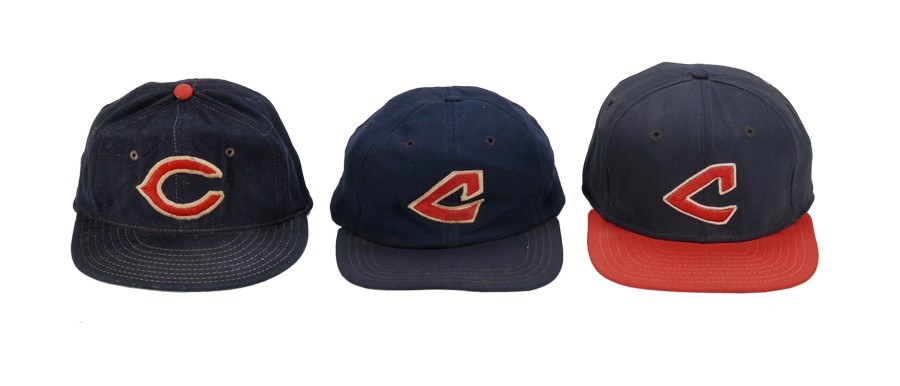 The Cleveland Indians uniforms and hats have undergone many style changes over the years. These nine caps are all game models or game-worn. There's a 1950s McAuliffe with "C" and Chief Wahoo on the front; a late 1950s by Wilson; early 1960s Wilson with "9" under the brim and was worn by Bob Hale, a mid-1960s red cap by Wilson with "40" under the brim and was likely worn by Stan Williams; a mid-1970s New Era with "Dorish" written under the brim; a late 1970s New Era with "18" under the brim; late 1970s Bob Feller Old Timers/Spring Training cap by New Era with "19" under the brim and a letter from Feller; a mid-1980s by New Era and early 1990s by New Era.