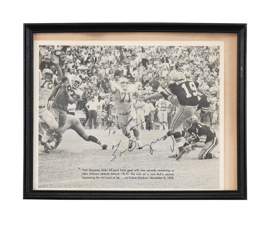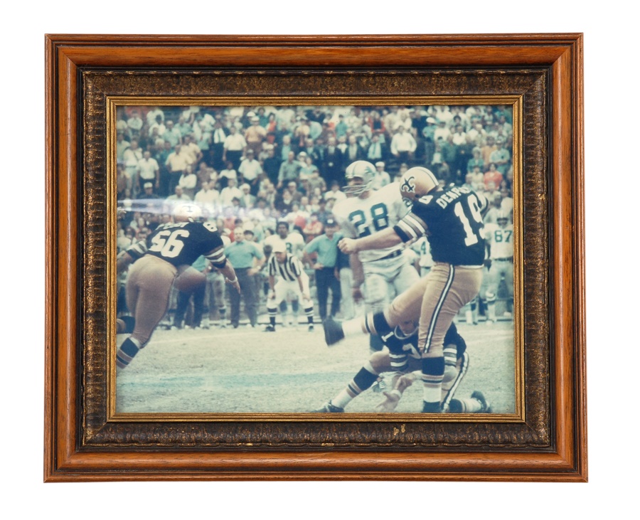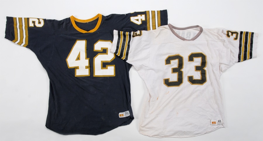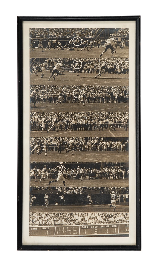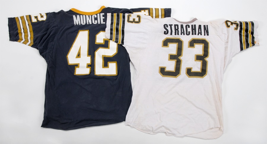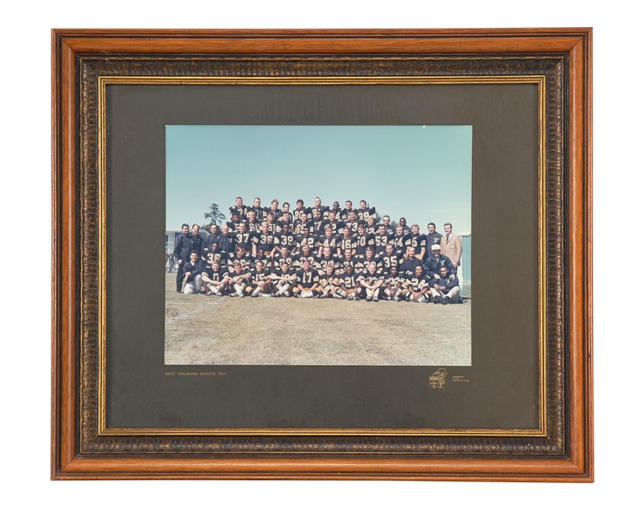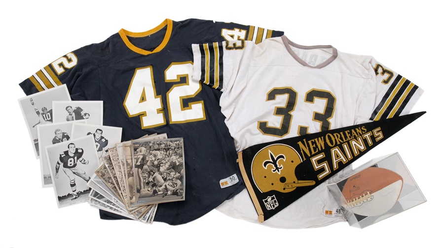 Archie manning would be proud... a treasure trove of Saints memories including a first-year (1967) large presentational team photograph. Also: a circa 1967 team signed football (EX-MT with signatures that rate 6/10); Over 20 photos from the 1960s-70s (four of which are framed); felt team pennant; and mid 1970s practice jerseys worn by Chuck Muncie and Mike Strachan, both of which have Russell tagging and show modest use.