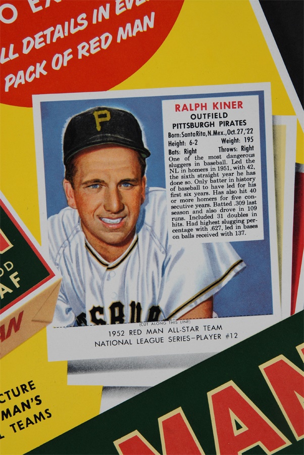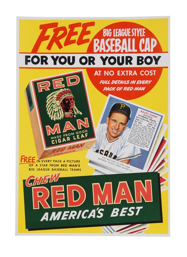 From back in the day when chewing tobacco and baseball naturally went together comes this near-mint condition 11x15" store poster advertising the Red Man brand. The highlight is Pittsburgh Pirates star (and Hall of Famer) Ralph Kiner, shown on one of the baseball cards free in every pack of tobacco.