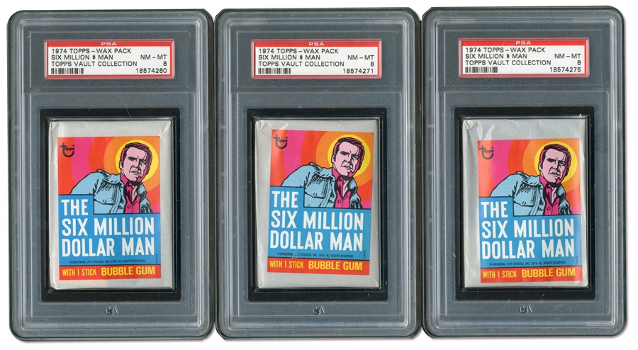 Beginning in 1951, Topps started producing baseball cards, and before long, the company became the standard-bearer for the industry. But within a few years, the company that originally manufactured bubble gum expanded to non-sports cards and stickers pertaining to the fads of the day such as outer-space (1950s), the Beatles (1960s), Cabbage Patch Kids (1980s) and Pokemon (1990s). But the 1970s proved to be a highly lucrative decade for the company. Not only were baseball and football cards at the height of their popularity, Topps struck gold with "Wacky Packages" and "Star Wars" cards. During this time, these very scarce, test-issue wax packs of the "Six Million Dollar Man" were produced, based on the popular TV show starring Lee Majors. The packs are all graded PSA 8 (NM-MT) and hail directly from the Topps Vault archive. "The Six Million Dollar Man" chronicled the adventures of a former astronaut with bionic implants and it ran from 1974 to 1978 on ABC.