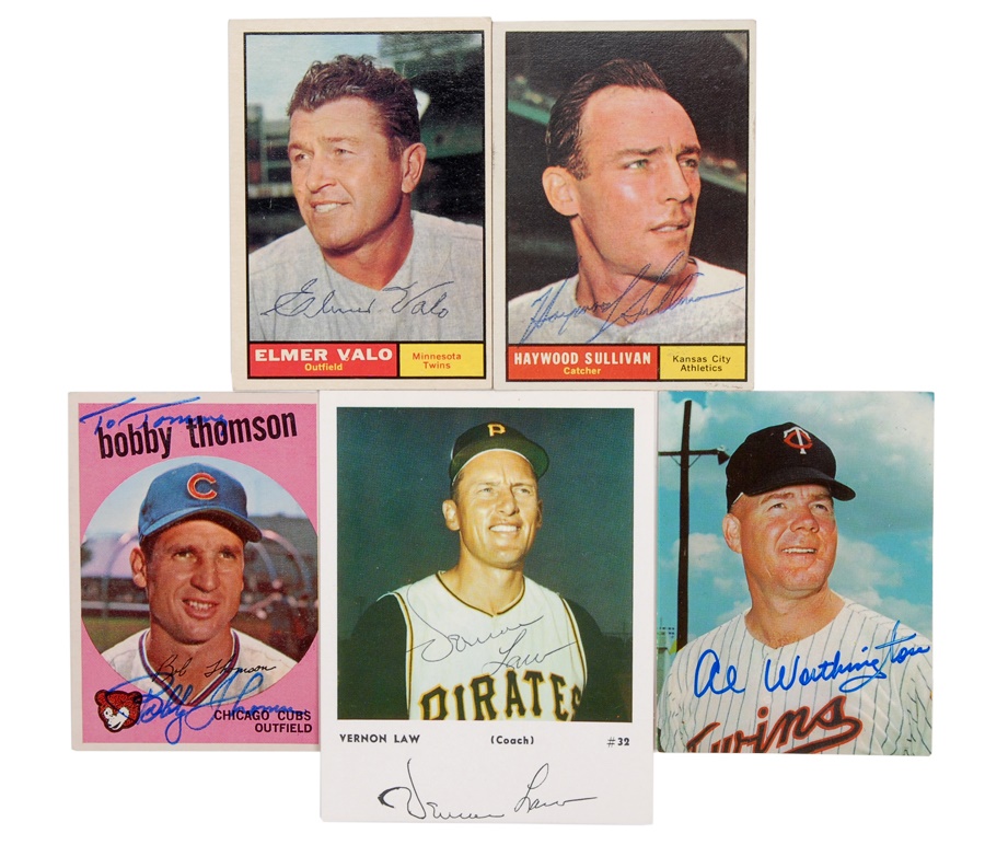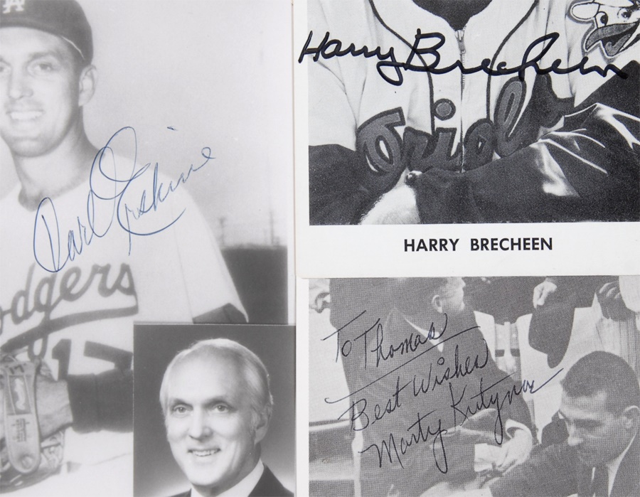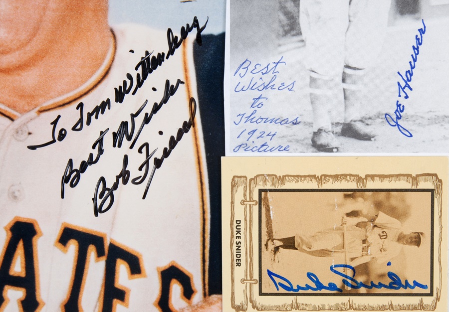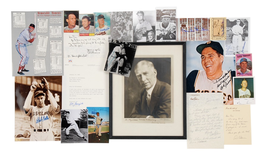 Nearly everything in this assortment is baseball-related. All are flat items, including a vintage Connie Mack signed studio photo (personalized), a Blanchard and Davis signed Life Magazine, Stan Musial signed photos, Tom Watson signed photo (personalized) and many signed baseball cards. The lot includes a stack of signed letters written to "Tommy" by former ballplayers. Many tell him how they no longer have any of their caps. EX condition overall.