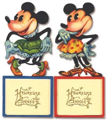 "Heureuse Annee" exclaims this early Parisian version of the most famous cartoon mouse on earth. We wish Mickey had always stayed like this-but what's with the frilly skirts he's wearing? Each measures 8" in height, with easel back. Amazing EX-MT condition.