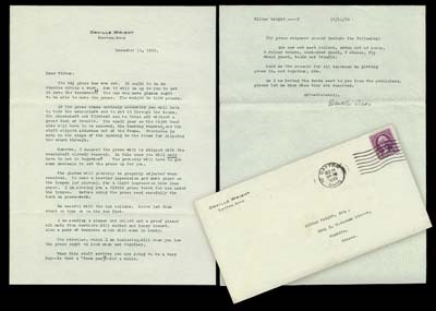 One of the pioneering broth-ers of aviation writes to the son of the other. Typewritten two-page note on Orville's personal letterhead discusses the assembly of a printing press. We can see the mechanical mind at work. Closes, "Affectionately, Uncle Orv." Signature is in perfect dark black ink. Includes original mailing envelope, noting recipient as "Wilbur Wright, Esq." NRMT.