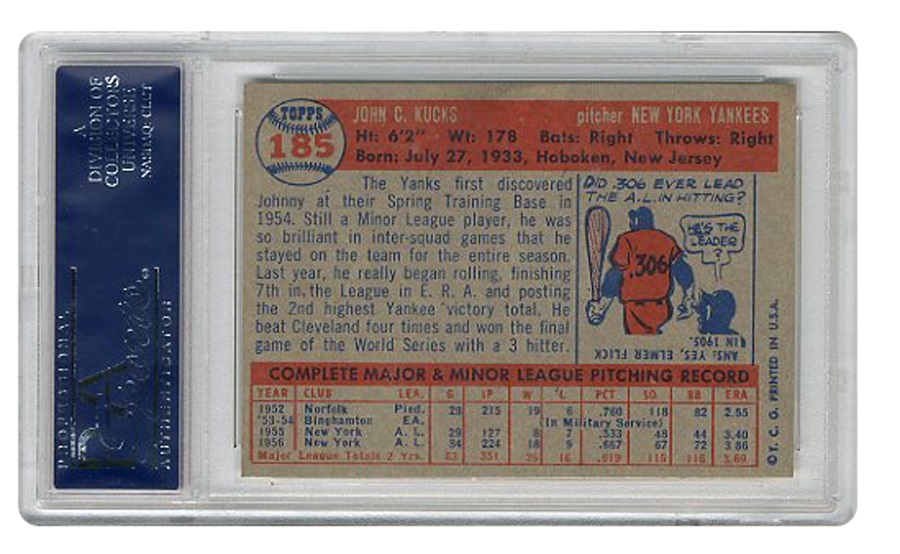 Lot # 415: 1957 Topps Johnny Kucks Card (PSA MINT 9)