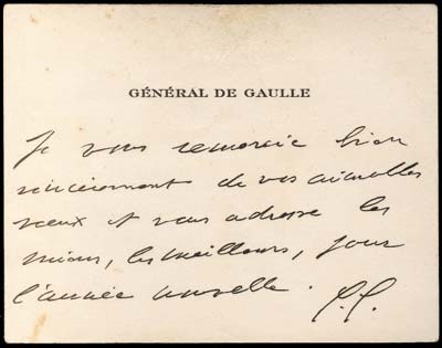 Brief note is on the stationery of "General De Gaulle." It is written in fresh fountain pen ink in French in response to a Cuban Official at the time of the proposed entry of Great Britain into the Common Market. Mint signed at the bottom by DeGaulle with his ini-tials. Heavy paper card measures 4.5x3.5" and is EX+.