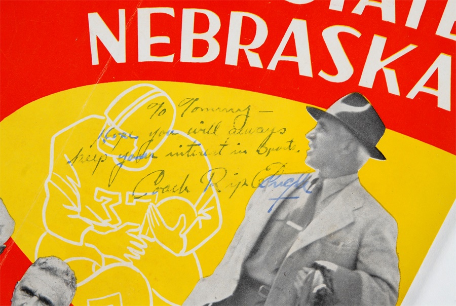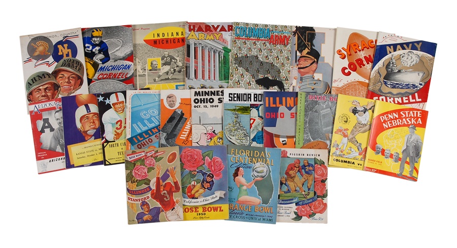 A college football historian’s dream! This collection of 271 publications includes Bowl Game and regular season programs spanning from coast to coast. The majority of the material is from the late 1940s and 1950s. Bowl programs include 1930s examples from the Rose Bowl. Also featured are the Orange Bowl, Senior Bowl, and more. The list of teams is virtually endless - Michigan, Army, Navy, Notre Dame, Penn State, Yale, Harvard, and so on. Rarities include a program from the 1968 tilt between the Green Bay Packers and the College All-Stars. Condition averages VG with many better. Big names galore are featured on some of these rosters.