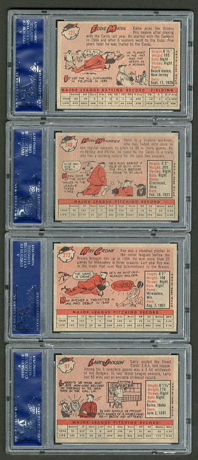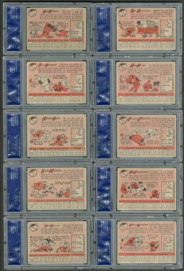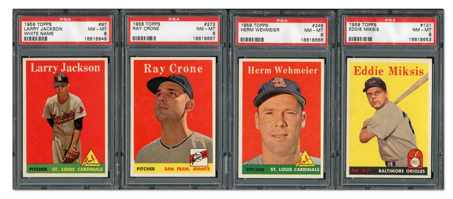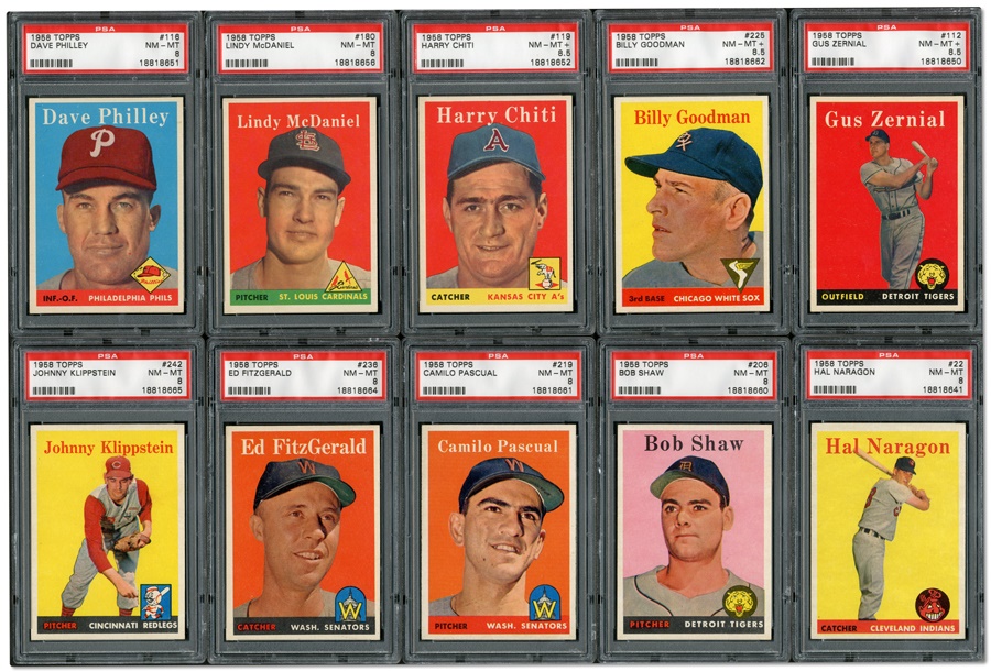 This baker's dozen of plastic-encased cards from the 1958 Topps set features: Billy Goodman of the White Sox, Gus Zernial of the Tigers, Harry Chiti of the A's, Lindy McDaniel of the Cardinals, Hal Naragon of the Indians, Bob Shaw of the Tigers, Camilo Pascual of the Senators, Dave Philley of the Phillies (of course), Eddie Miksis of the Orioles, Ed Fitzgerald of the Senators, Johnny Klippstein of the "Redlegs," Herm Wehmeier of the Cardinals, Ray Crone of the Giants and Larry Jackson of the Cardinals. All cards are graded NM-MT, with the first two rating even higher (NM-MT+). The Crone card is of special interest since this was the first season the Giants played in San Francisco.