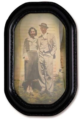 One of the most interesting photographs we have ever offered. This is from the family of legendary outlaw John Dillinger, and it hung in the home of Dillinger's aunt. Spectacular 16x10" vintage photo of Dillinger with his girlfriend Evelyn Frechette is from his earliest days. Marvelous because it was a woman who betrayed him (the famed "Lady In Red") at the movie house ambush where he was gunned down by Melvin Purvis & the FBI. Though not the lady in red, this was his "moll," Dillinger's "favorite girl friend" according to the book Bloodletters and Badmen by Nash. They are posed in front of the family home. Image is in full color, as it has been hand-tinted, a common practice of the day. Slightly oval in shape, with convex glass in attractive frame. The only photo of its type we know to exist, and a very important piece. Great LOA.