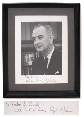 J.F.K.'s successor strikes a presiden-tial pose. His EX-MT inscription below reads, "To Victor B. Levit, with best wishes, Lyndon B. Johnson." Professionally matted and framed for a dignified look. 8x10".