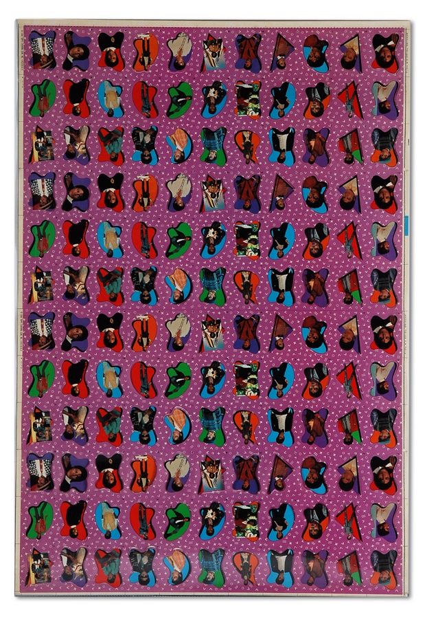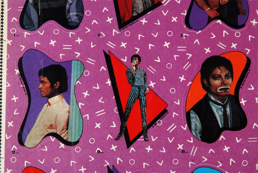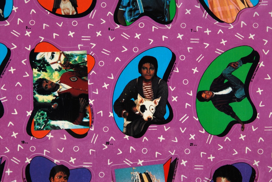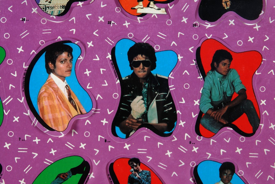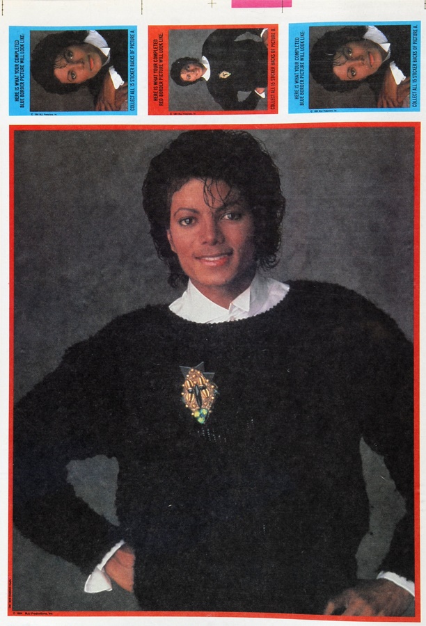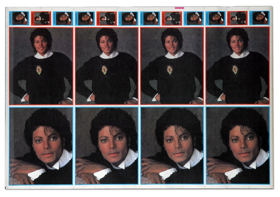 At the height of Michael-mania, as "Thriller" was on its way to becoming the best-selling album ever, Topps put out this series of stickers. These are the uncut sheets from the manufacturer, with more than 120 sheets and 132 stickers on each. Sheets are backed with larger photos of Michael formed by the backs of these stickers when assembled by consumers in 'puzzle form.'