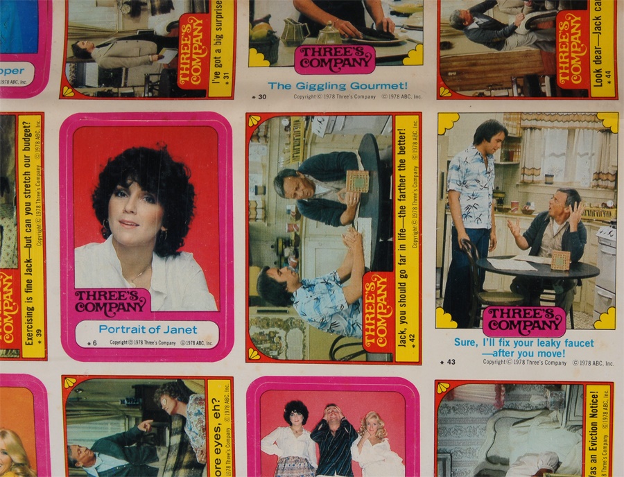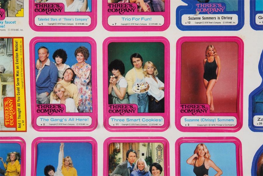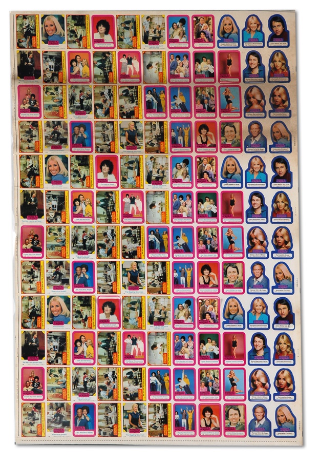 Come and knock on their door, then "stick around." Uncut sheets of Topps' series of 132 "Three's Company" cards and stickers, on blank white backs - from the show's second ratings-powered season on ABC-TV - include a couple featuring sexy poses from Suzanne "Chrissy" Somers. Excellent condition, some creasing from the sheets having been rolled.