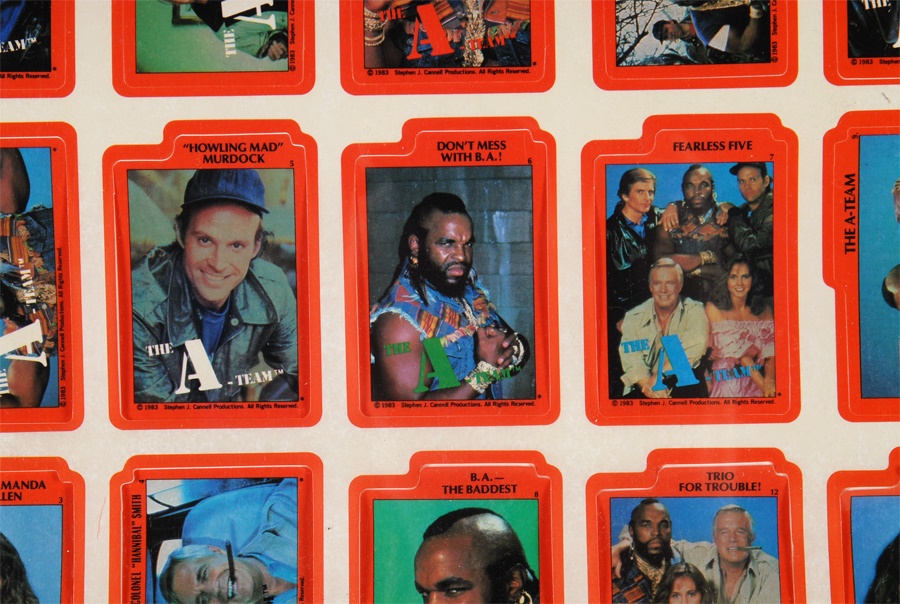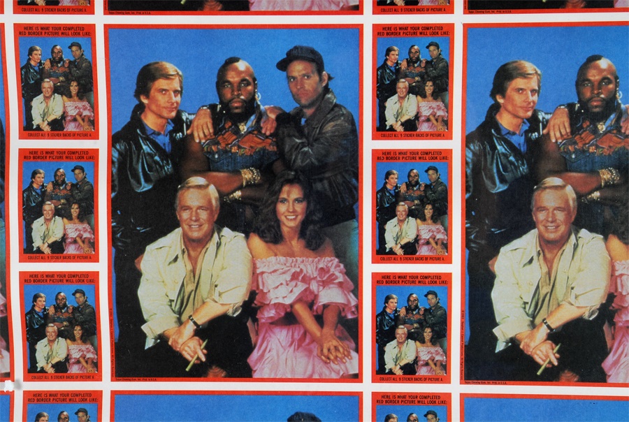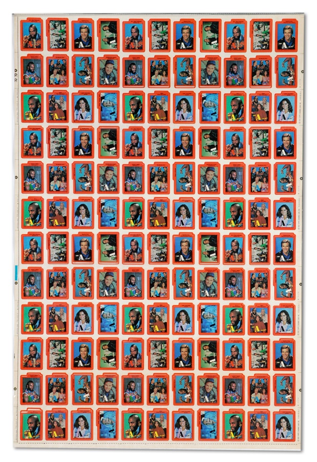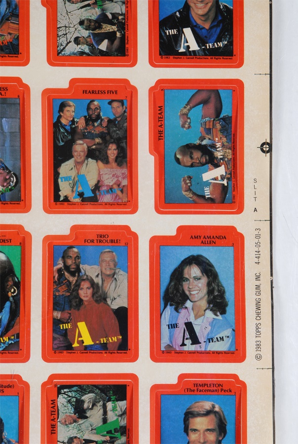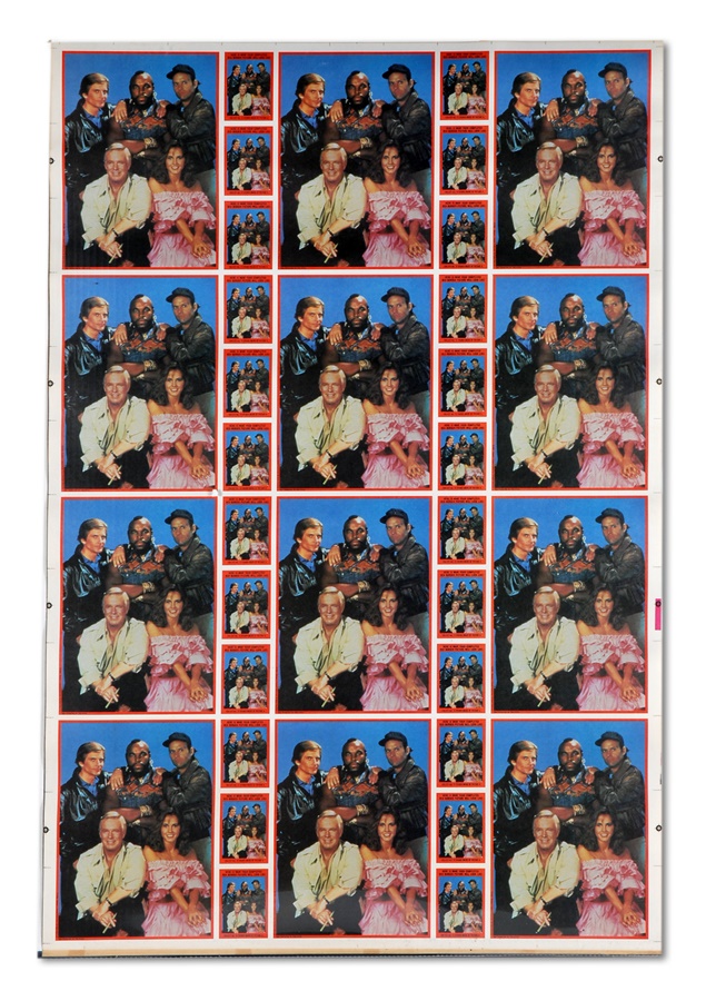 We pity the fool that misses out on these. From 1983, when "The A-Team" was one of network TV's top shows, it's Topps' stickers on the original uncut sheets. Over 50 sheets, 132 stickers per sheet, most of Mr. T. Backs show how cast photos look when card backs are assembled puzzle-style by consumers. Sheets were rolled so some stickers have peeled.