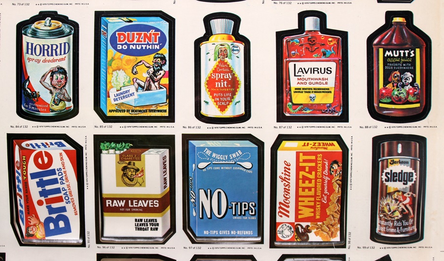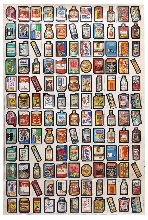 This is Series 2 of Topps' popular sticker spoofs of product packaging (such as "Lavirus" mouthwash, "Rice-a-Phoni" and "Mutt's" apple juice), in the original uncut sheets from the manufacturer from 1979. 100 sheets, 132 cards on each. Excellent condition, rolled sheets can be flattened out.