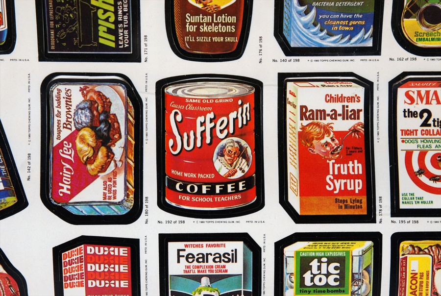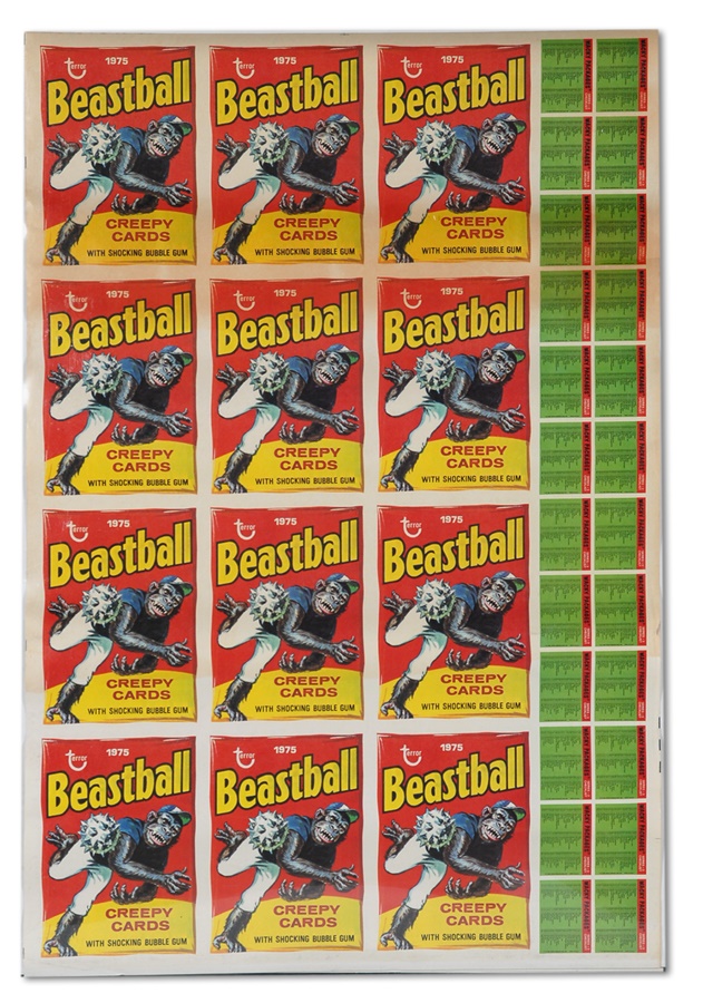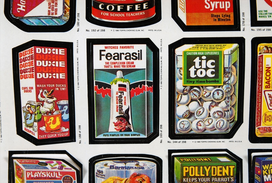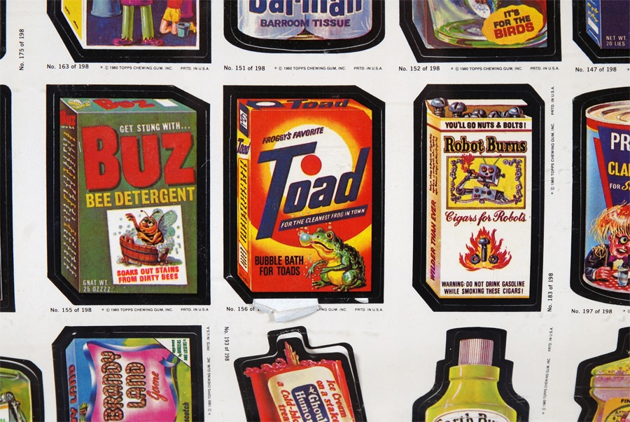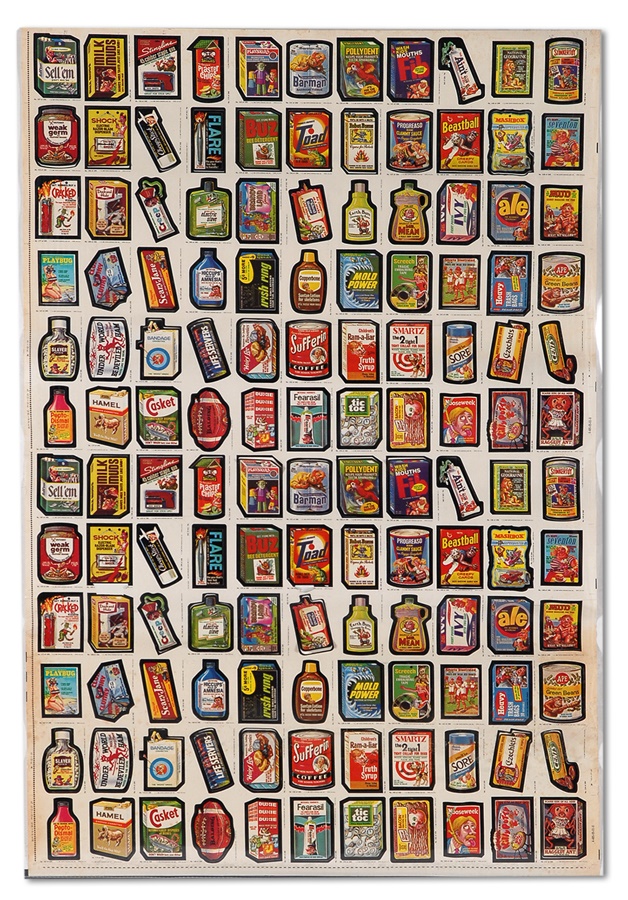 This is Series 3 of Topps' popular sticker spoofs of product packaging (such as "Nooseweek" magazine, "Life Servers" candy and "Killy Putty"), in the original uncut sheets from the manufacturer from 1980. 100 sheets, 132 cards on each. Excellent condition, rolled sheets can be flattened out.