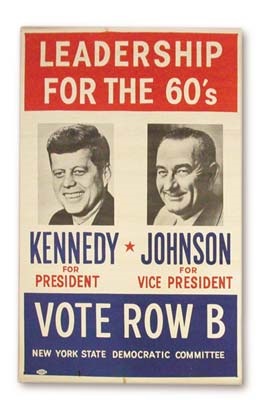Rare regional Presidential Campaign "Leadership For The 60's" poster, sponsored by the New York State Democratic Committee, "Vote Row B." Bottom of poster has an "Amalgamated Lithographers of America, New York Local #1" printing label. Pictures of both adorn a red, white and blue background. Poster is EX. 26 x 40".