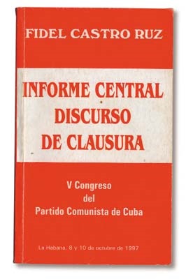 Perfect 10/10 black ink signa-ture graces the title page of this volume penned by the Cuban dictator himself. Informe Central Discurso de Clausura is a 205-page paper-back in EX-MT condition.