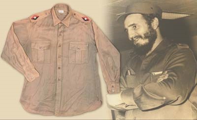 Actual uniform worn by Cuban dictator Fidel Castro in 1962. It is his silky brown khaki Army of the Revolution shirt with his "cigar pocket" at the front. It even has the embroidered red, black & white starred epilates on the shoulders that was worn only by Castro and his very top generals. This shirt was originally obtained from a Cuban gentleman who was one of Castro's closest aides and comes with his letter of authenticity (also comes with LOA from the gentleman who obtained it from him). The aide lived in El Vedado, which is one of the more affluent sections of Communist Cuba. The aide got it from Castro at the time as a momento of the man who was the head of his country and the Revolution. Tagged in the collar, "Fin de Siglo...San Rafael Aguila Habana." Comes with two vintage photographs of Castro wearing this exact shirt. Nice wear and Excellent condition.